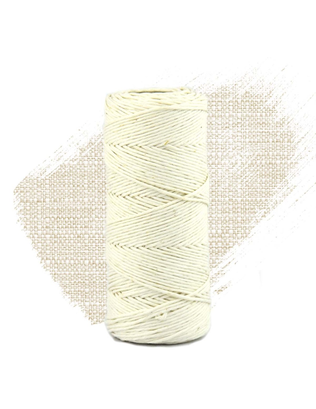 90-meter-spule aus reinem hanfgarn mit einem durchmesser von etwa 1 mm, auf einem kartonschlauch gewickelt. Dieser Faden hat einen wachsartigen Effekt, der durch Kompression erhalten wird, was ihm eine glatte und beständige Textur verleiht.