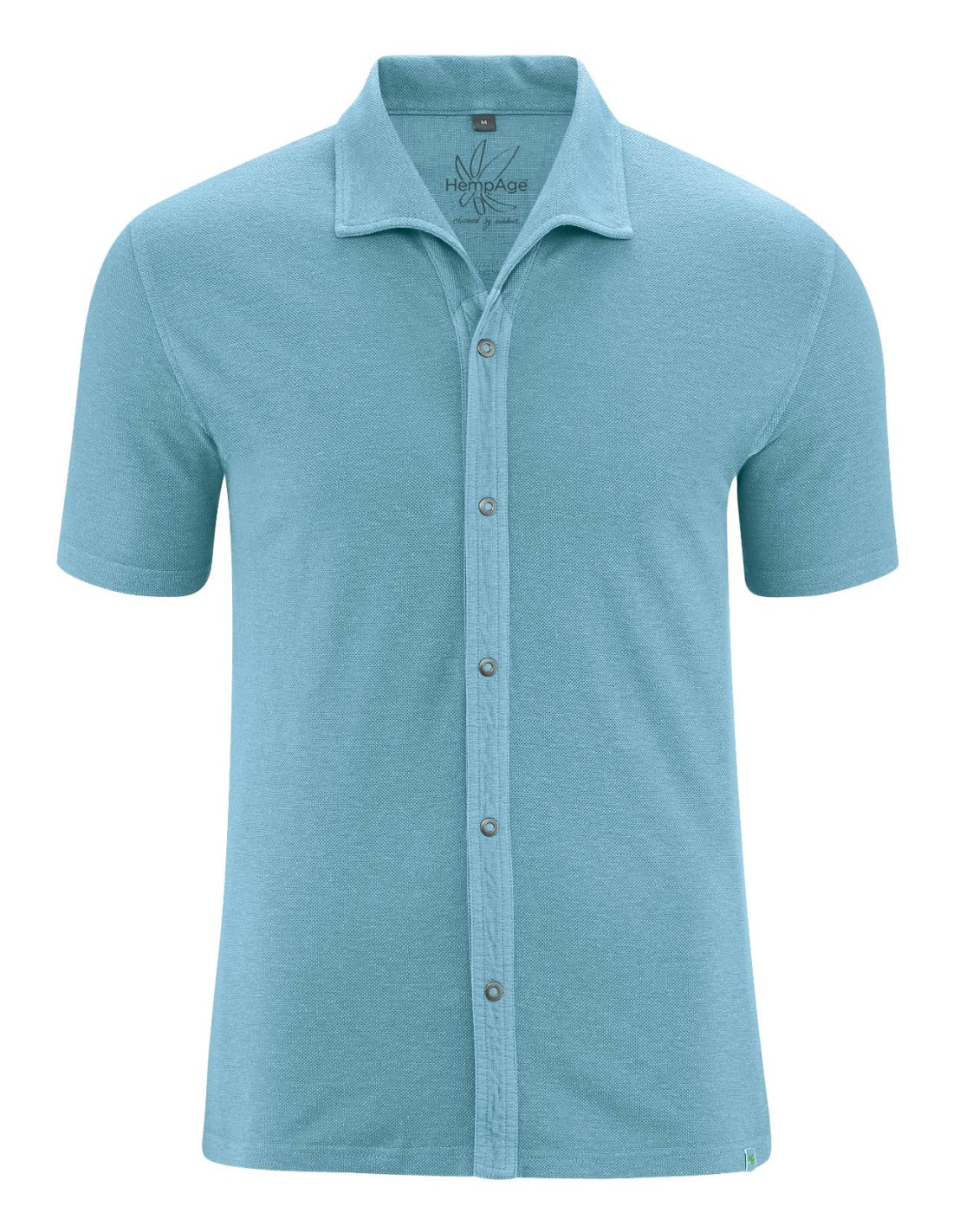 Dieses Sommertrikot aus Biohanf und Baumwolle bietet eine normale Passform für optimalen Komfort an heißen Tagen. Seine gewebte Knöpfpfote fügt einen Hauch von Eleganz, während nickelfreie Metallknöpfe garantieren eine dauerhafte Oberfläche.