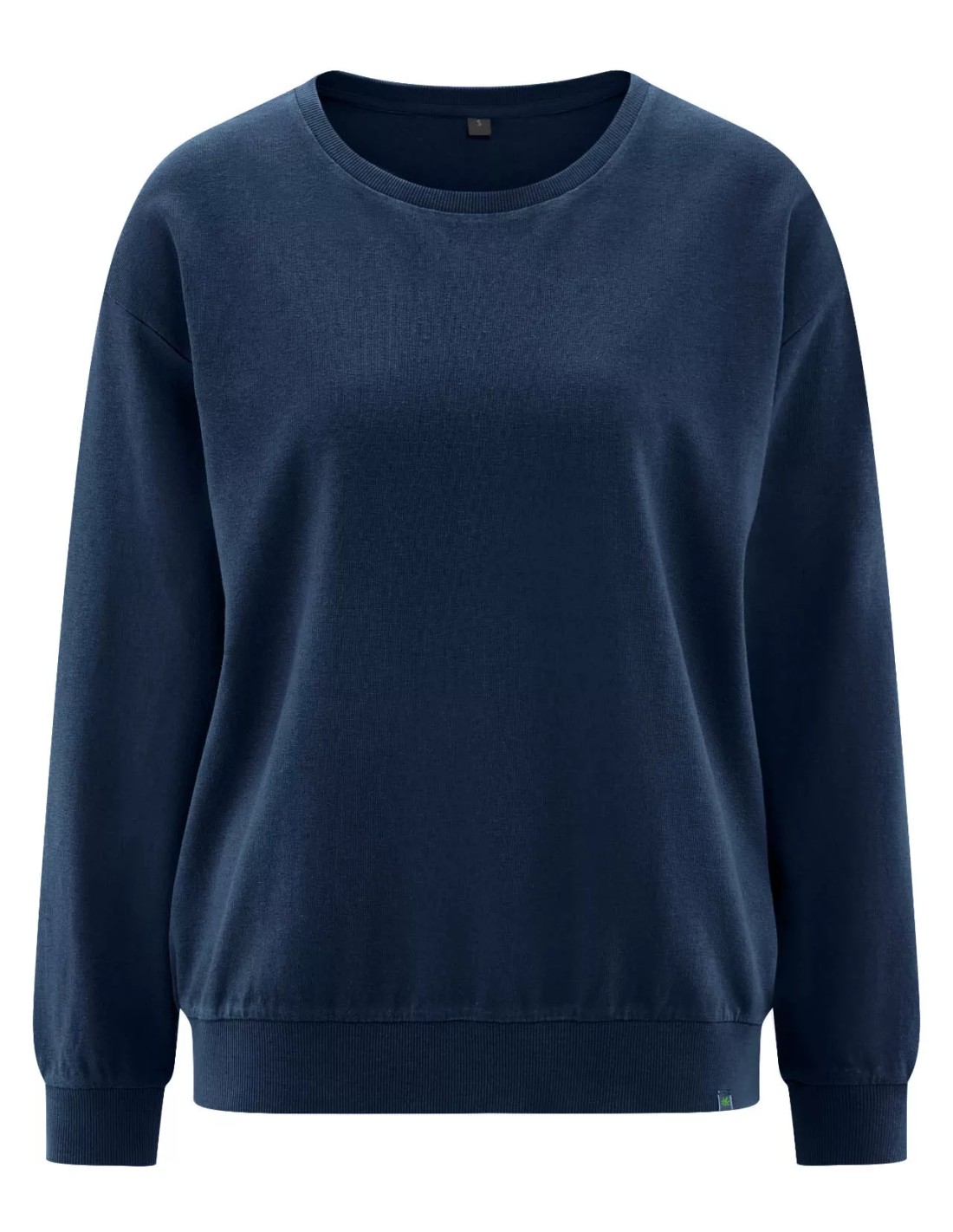 Dieses langärmlige Sweatshirt, hergestellt in Hanfjersey und Bio-Baumwolle, zeichnet sich durch seinen lässigen und übergroßen Tasse aus.