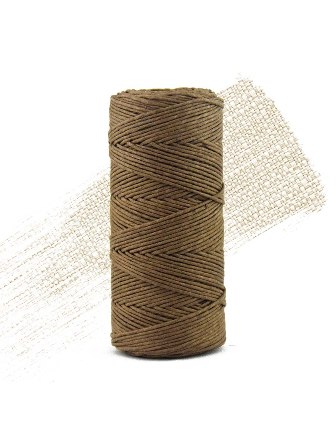 Bobina de 90 metros de cáñamo de hilo puro con un diámetro de aproximadamente 1 mm, envuelto en un tubo de cartón. Este cable tiene un efecto encerado, obtenido por compresión, lo que le da una textura suave y resistente.