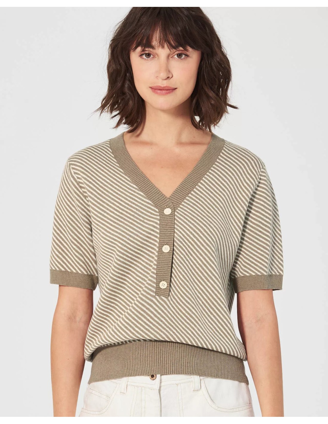 El suéter de manga corta es una pieza única que combina la comodidad y la originalidad. Con su corte normal, ofrece una silueta informal mientras es elegante. Hecho en un tejido de punto, se distingue por un patrón de rayas diagonales que trae un toque de dinamismo.