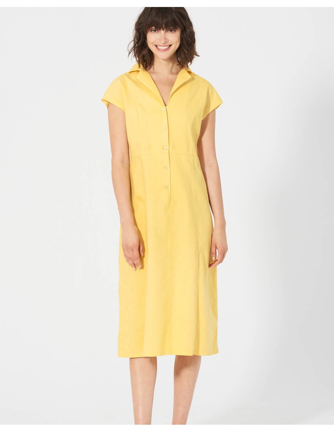 Este elegante vestido DH146, diseñado en cáñamo y algodón orgánico, se distingue por su corte normal y un estilo atemporal. Hecho de tela tejida de calidad, cuenta con un collar de solapa refinado y botones de madre de perlas que agregan un toque de sofisticación.