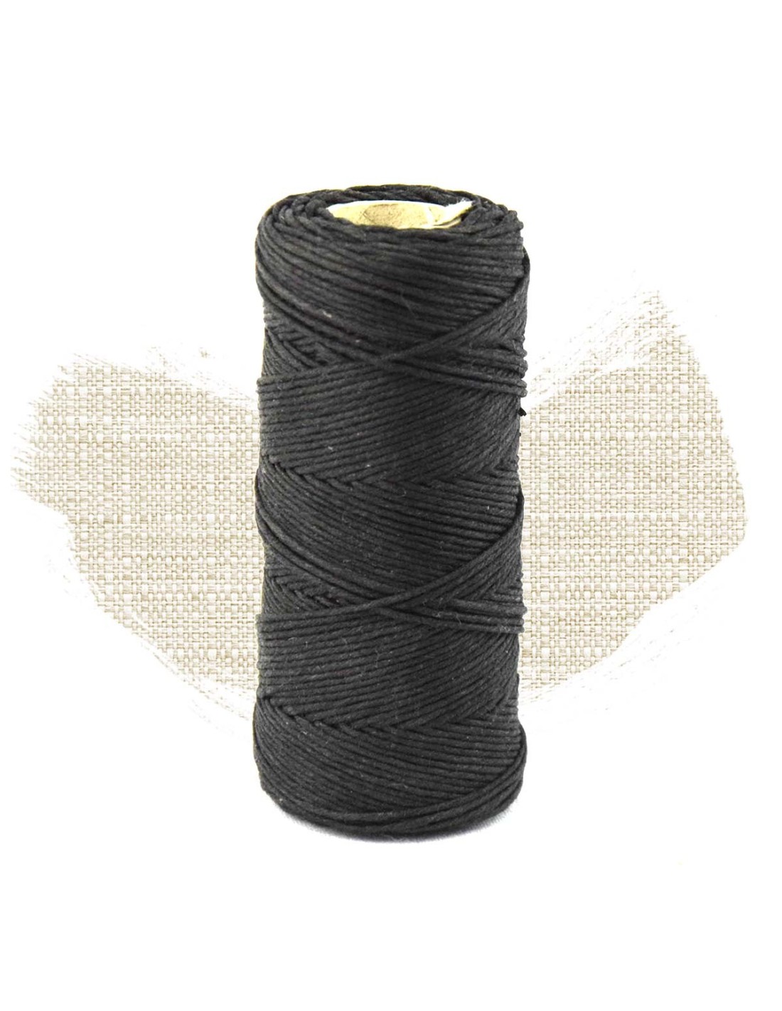 Bobine de 90 mètres de fil pur chanvre d'un diamètre d'environ 1 mm, enroulée sur un tube en carton. Ce fil présente un effet ciré, obtenu par compression, qui lui confère une texture lisse et résistante.