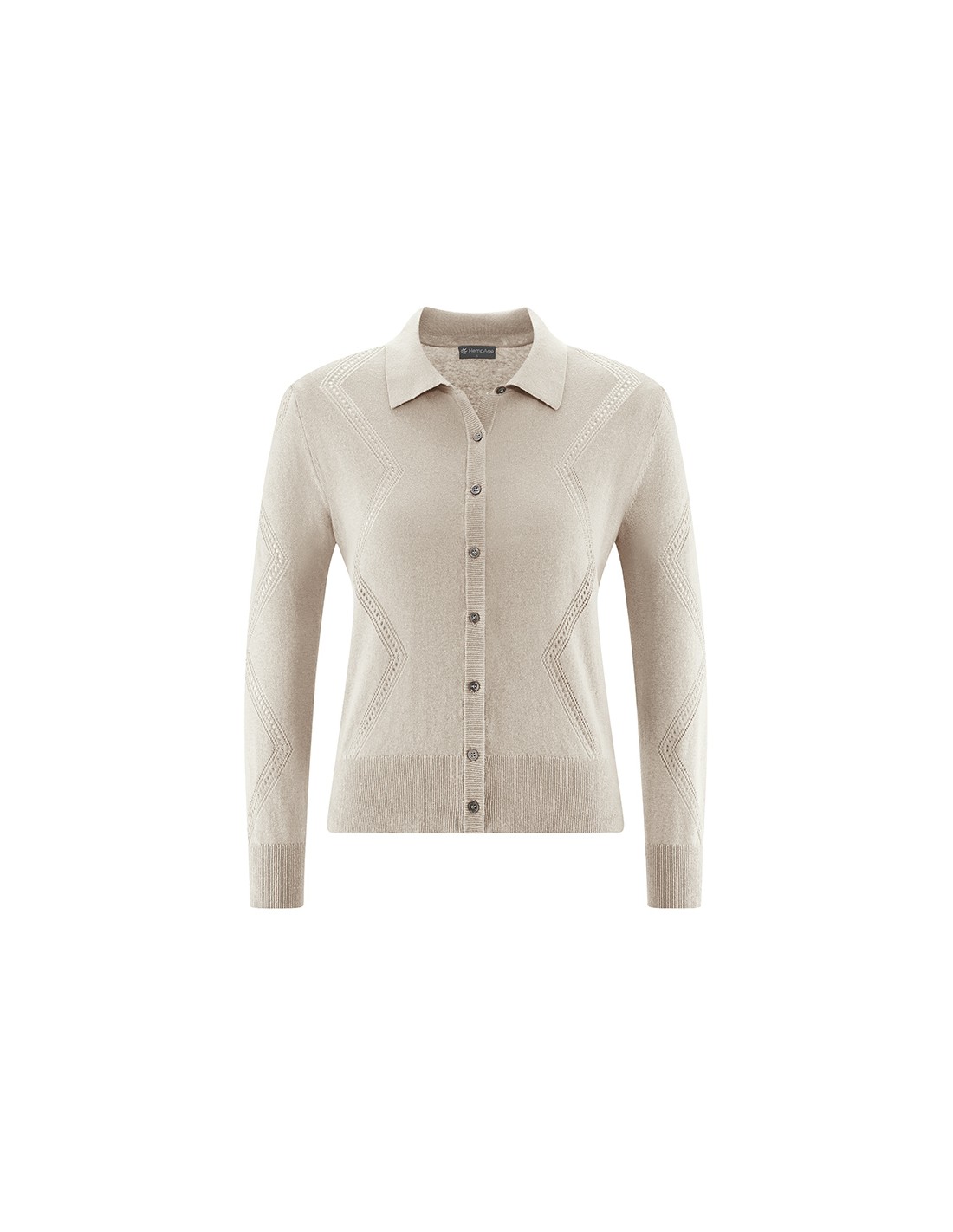 Ce gilet à col présente une coupe ajustée et une maille plate travaillée avec un motif en zigzag ajouré, qui apporte un détail discret et raffiné. Les boutons en nacre complètent l’ensemble avec une touche nette, tandis que les poignets côtelés donnent une finition soignée et confortable.