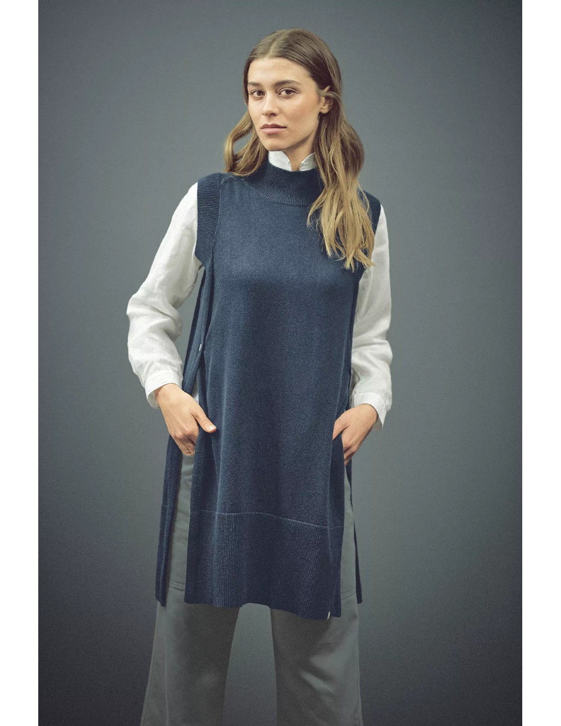 Il maglione senza maniche è una sala moderna e versatile, perfetta per sovrapposizioni. Realizzato in una maglia leggera di 315 gr / m², è confortevole e traspirante. La sua salita porta un tocco di raffinatezza, mentre i lati aperti, fissati da pulsanti di pressione di pietra, aggiungono una nota di originalità e praticità.