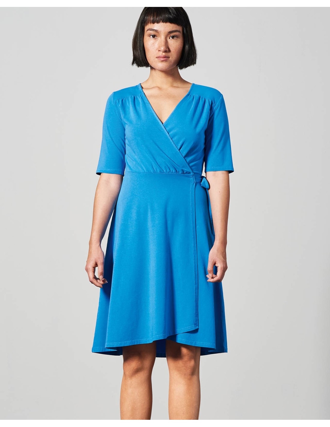 Questo abito in jersey, realizzato in cotone biologico, canapa e elastan, coniuga comfort e stile con una vestibilità che lusinga la silhouette. Il design portafogli sottile è arricchito da inserti in vita e spalla volanti, fornendo un tocco elegante e femminile.