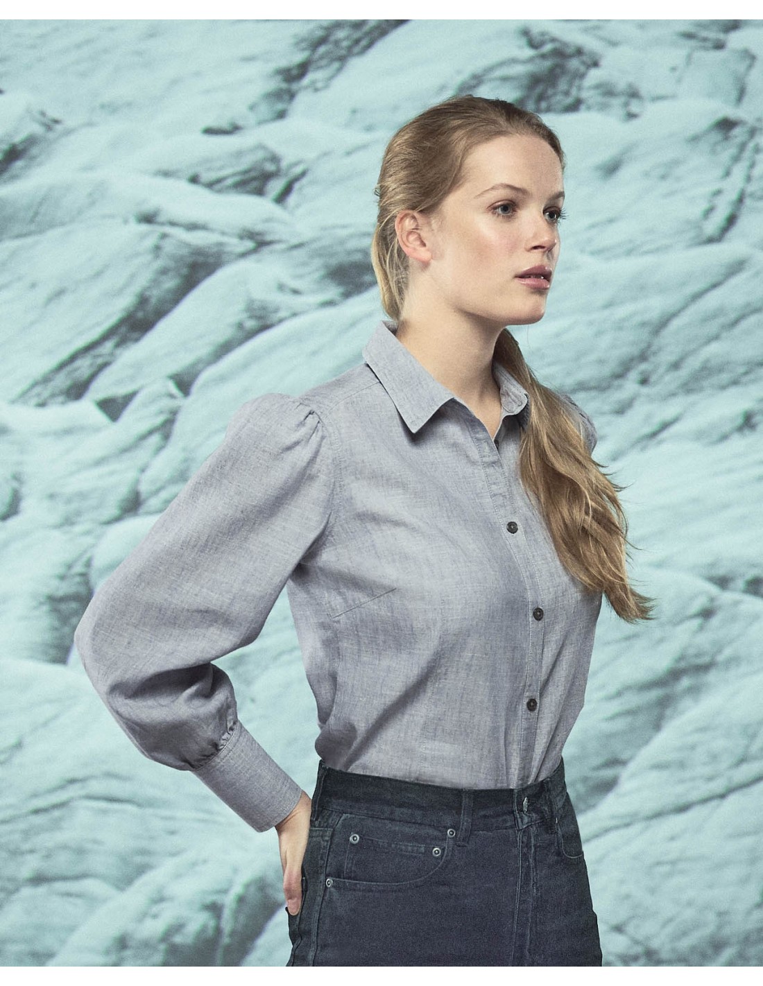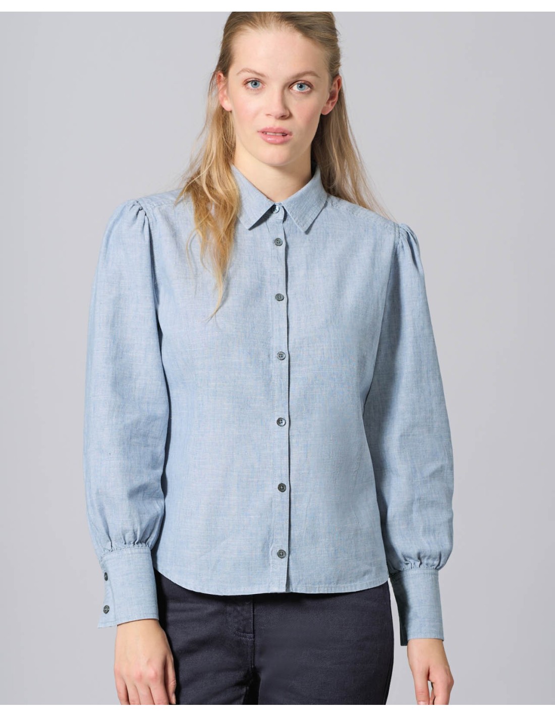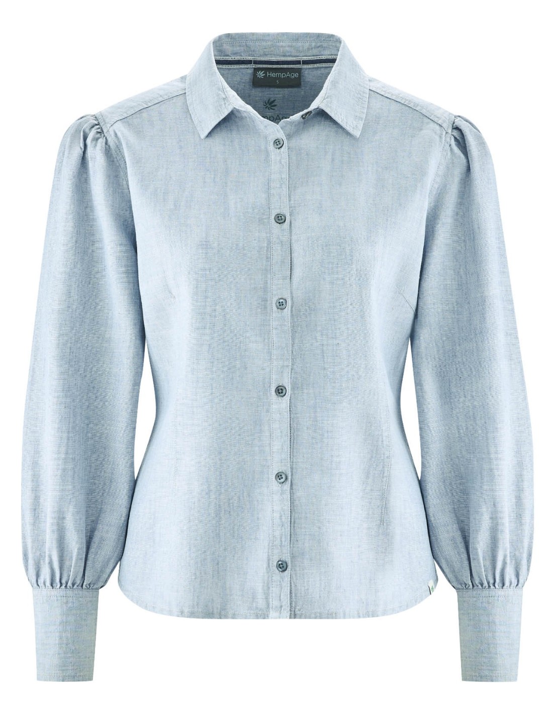 Questa camicetta a manica volatile, la canapa e il cotone organico, offre un taglio normale per una vestibilità confortevole ed elegante. Realizzato in tessuto tessuto con finitura jeans ispirata, ha una sezione curva che evidenzia la silhouette.