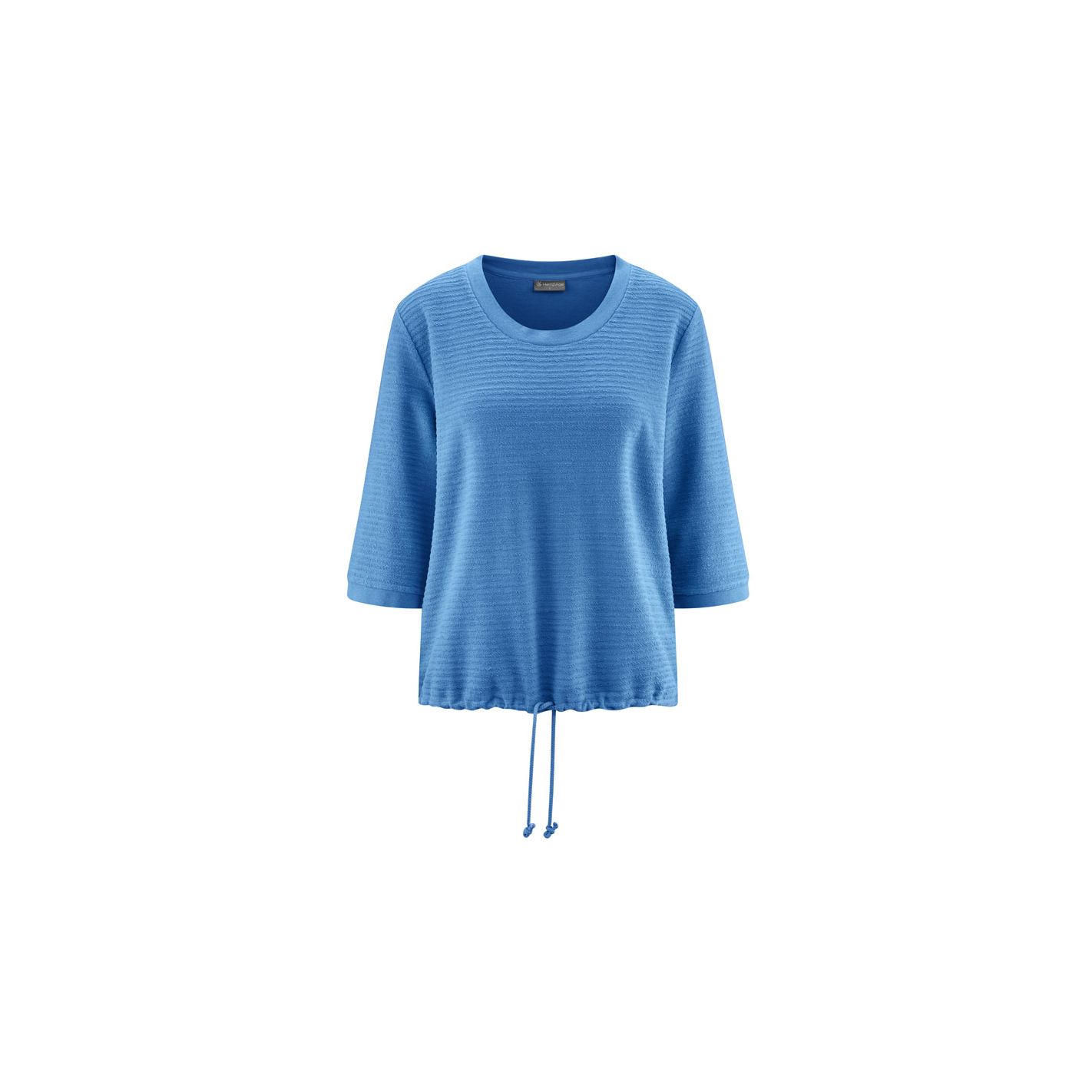 T-shirt da donna con un taglio largo, con maniche a 3/4 e motivo a righe in stile Nicki. Realizzato in una maglia morbida e confortevole, offre un tocco morbido e piacevole sulla pelle. L'orlo è regolabile grazie ad un cavo di serraggio, consentendo di personalizzare la silhouette secondo i desideri. Un modello vegano, ideale per uno stile casual e naturale su base giornaliera.